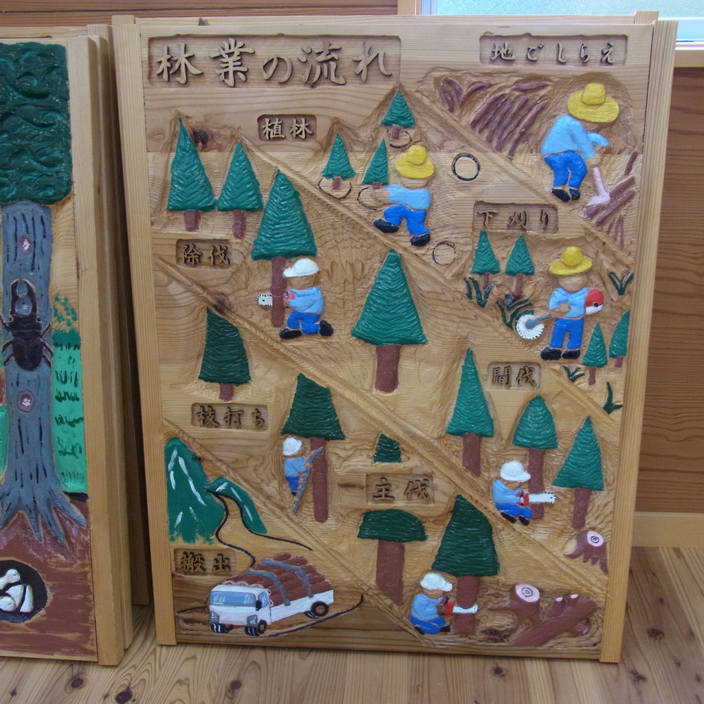 山の仕事や森林や木が私たちの暮らしに役に立っていることを子供たちに学んでもらうために、チェーンソーで彫った作品です。