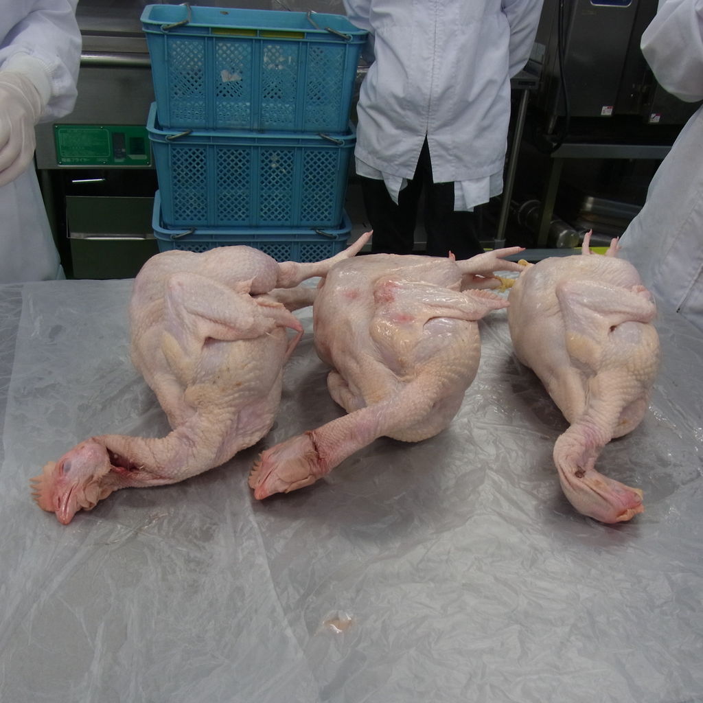 30年ぶりの鶏肉解体を、社員が見守る中で行いました。