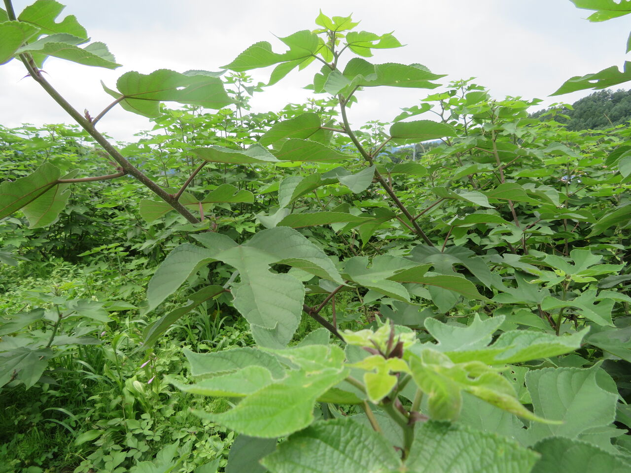 店主がみせてくれたぼくち、雄山火口(おやまぼくち)という植物の葉っぱからとれる繊維を蕎麦に練りこむことでつなぎとします。小麦粉が取れない当地ならではの工夫です。