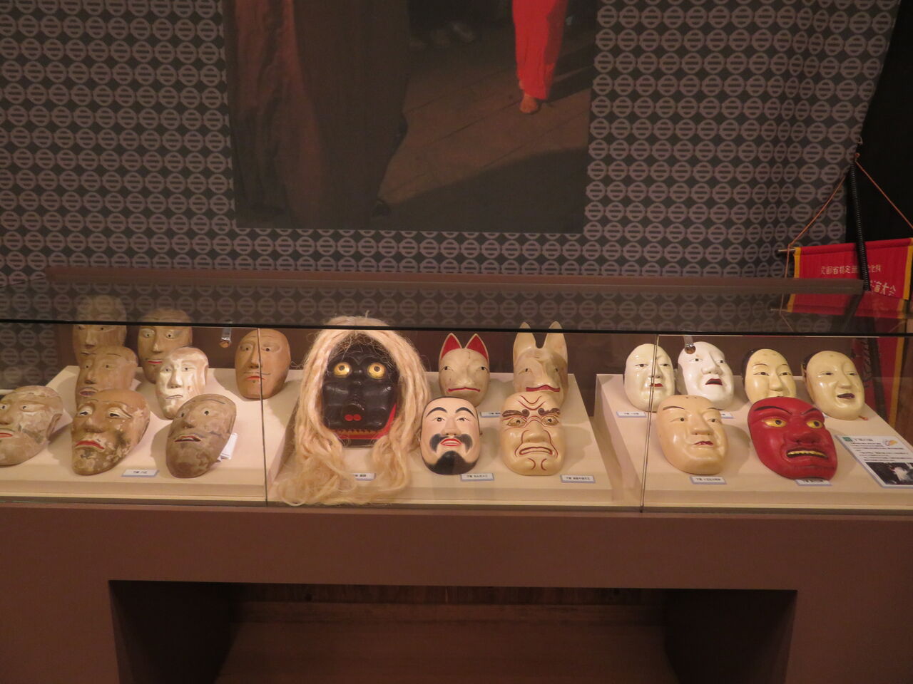 伝承館には各地区の面(おもて)の展示がいっぱい。