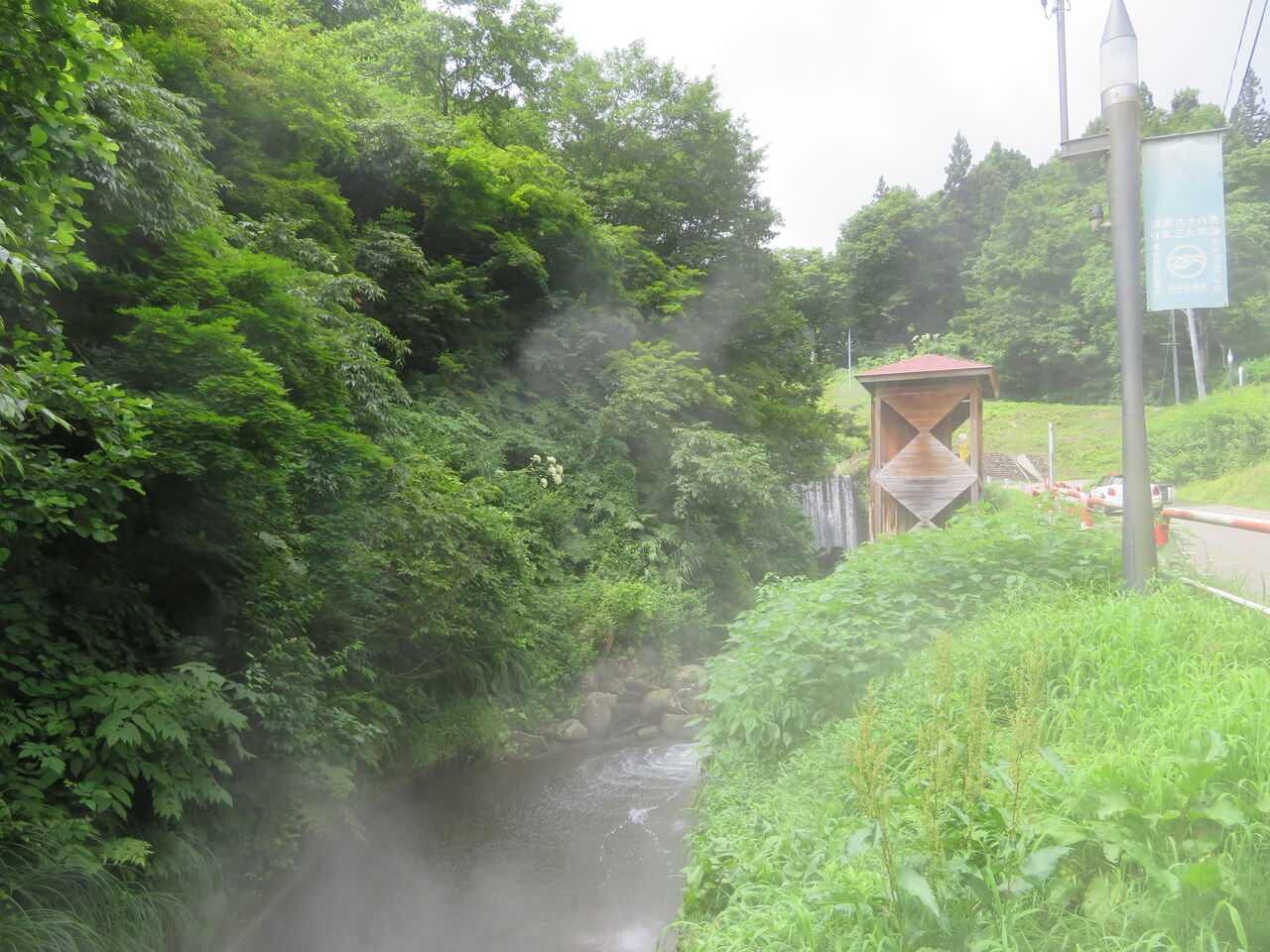 源泉、川から蒸気が立ち上っています。日本でも珍しい「ジオプレッシャー型化石海水の温泉」