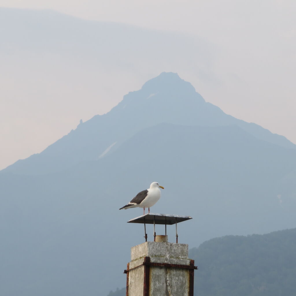 利尻岳を背景にウミネコが佇んでいます。