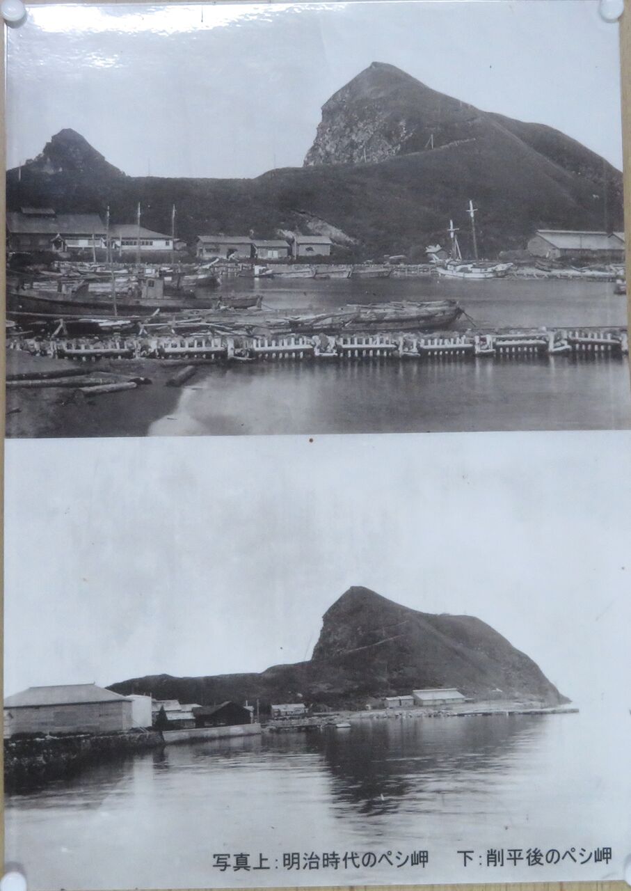 ペシ岬は明治時代には双頭の岩山でしたが、稚内の北防波堤ドームを作るために小さい方の岩山を掘削されて現在の姿になりました。