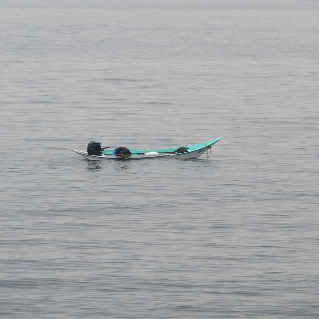 海岸を見ると漁をしている小舟が、船頭さんが足で舵を操作しながら海中を覗いています。