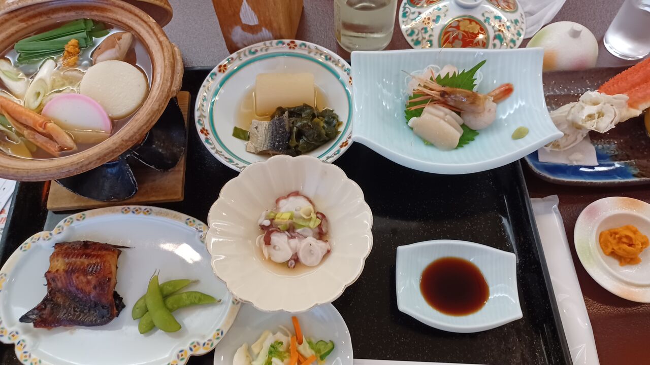 旅館の夕食は派手ではないが美味しかった。最後の味噌汁が特に印象に残ります。