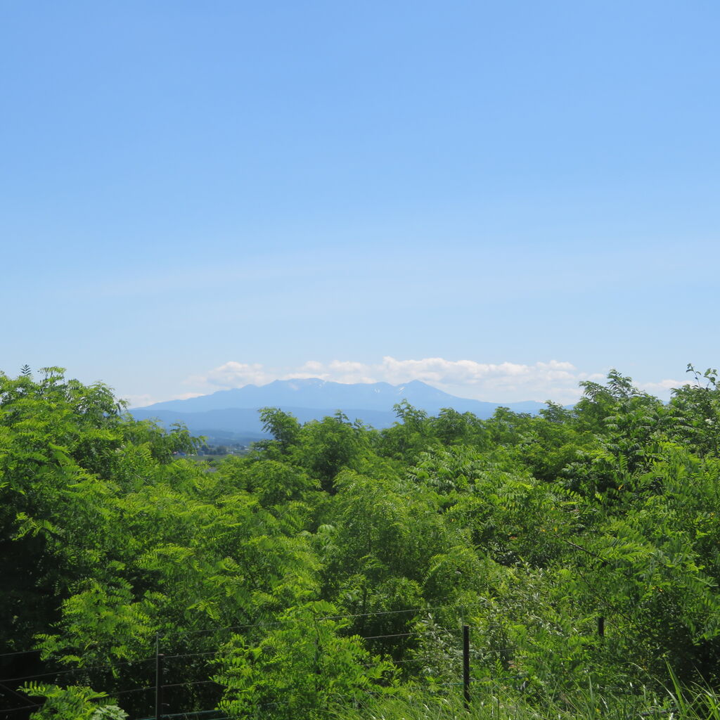 飼い主が犬を鎖につないでくれたので御嶽山の眺望を写そうと思いましたが生憎の曇り空。