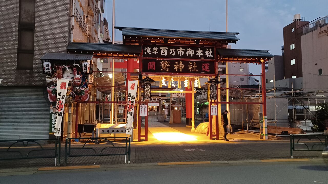 鷲神社、11月の酉の日に酉の市として豪華な熊手を売ることで知られています。