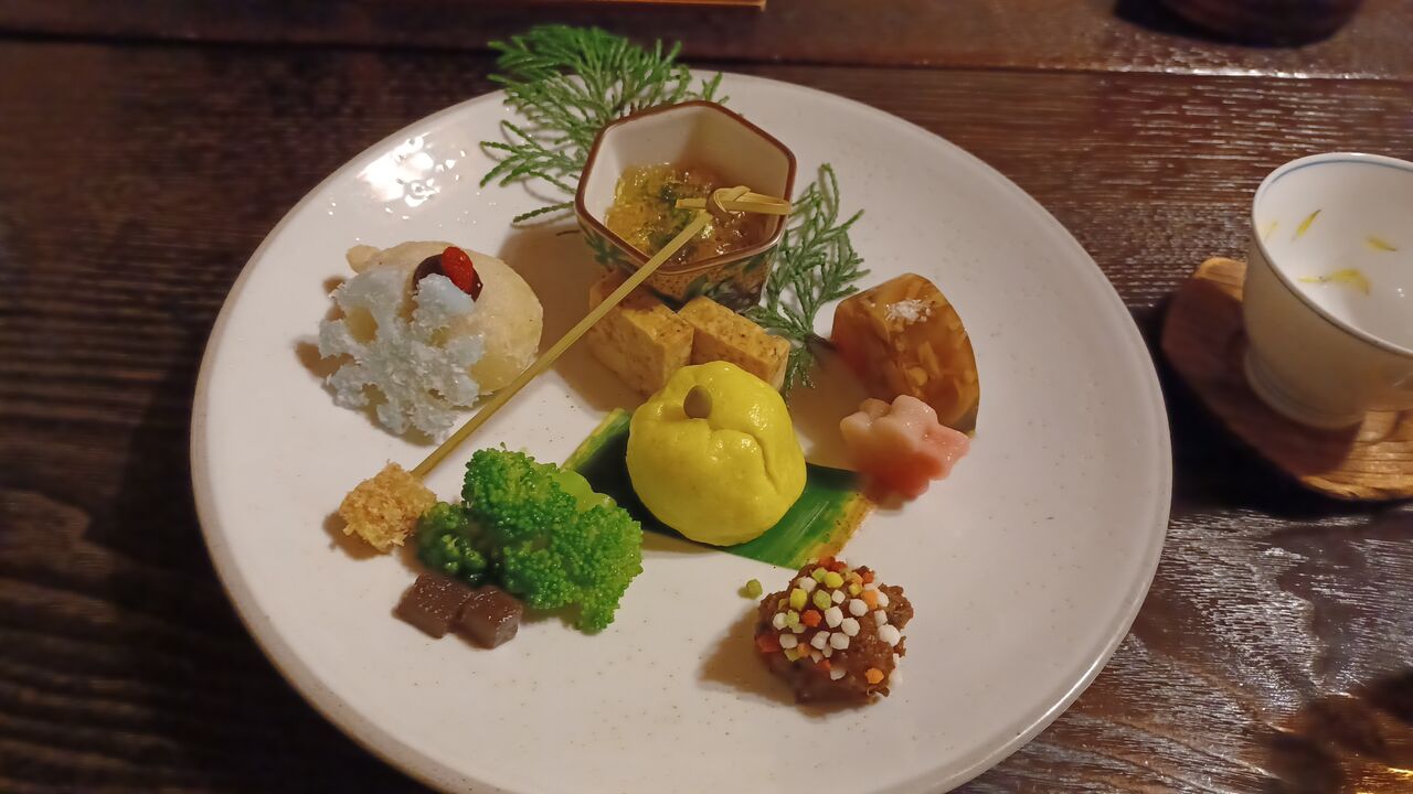 その数々をいただいて満腹、でも肉や魚はもちろん鰹節も使わない料理のだしには椎茸をはじめ植物性のだしが利いていました。
