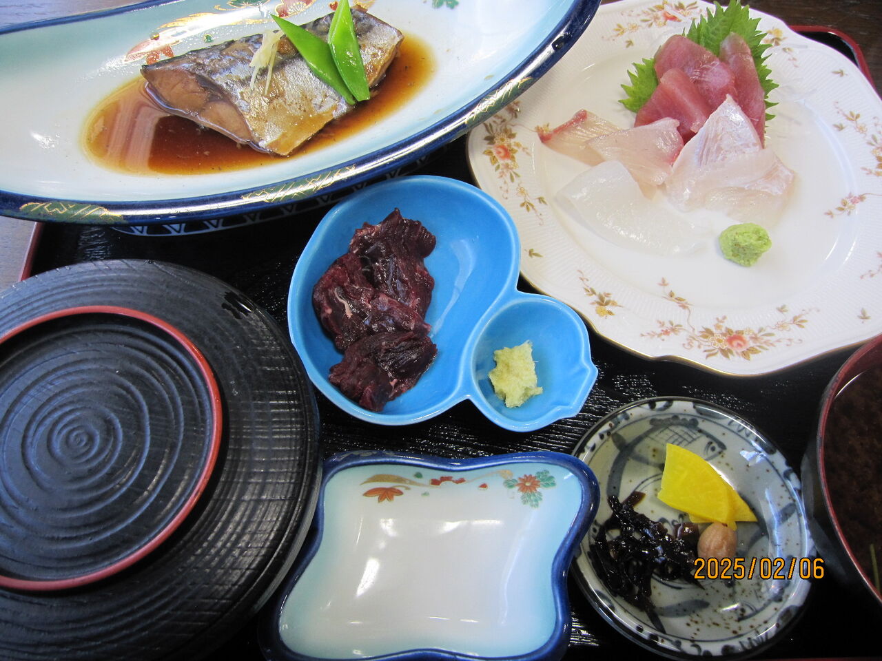 お造り定食1350円は何と、刺身以外にサバ煮と鯨の刺身が付いてきました。