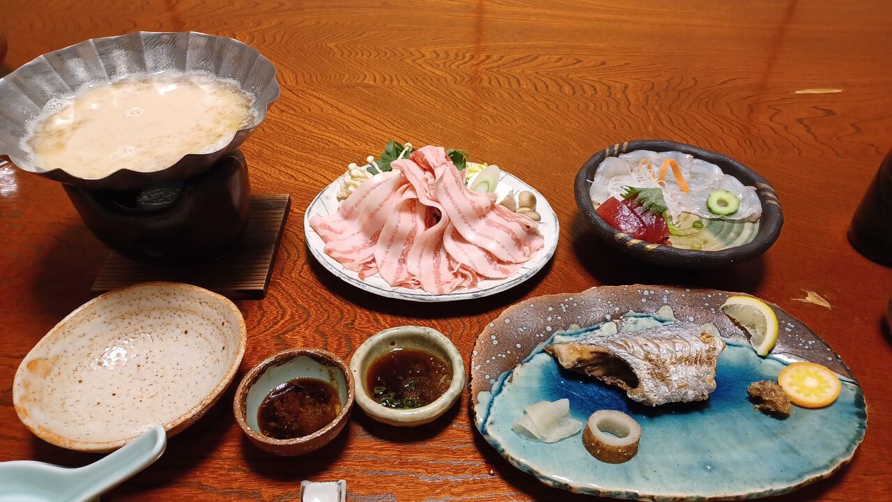 ひらめのお造り、熊野ポークの豆乳鍋、そして地元で獲れた太刀魚の塩焼きも旨かった。