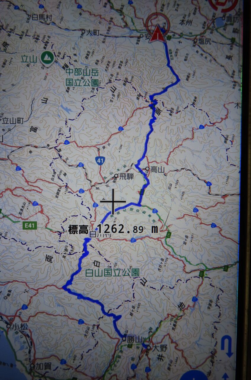 勝山から石川県に抜け、白山白川郷ホワイトロードで岐阜へ、そこから国道158号線に乗って安房峠を抜け国道の終点松本は渚を目指します。