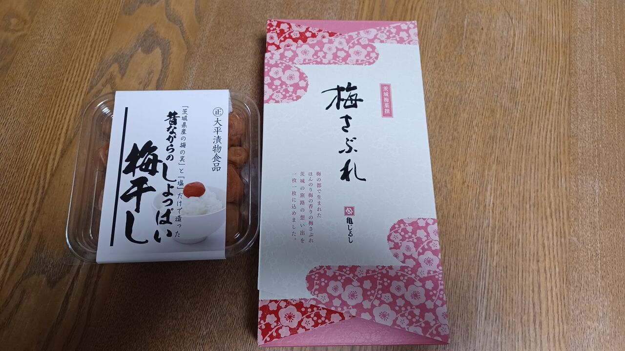 お土産は偕楽園で獲れたという梅を使った梅干しと梅サブレ、