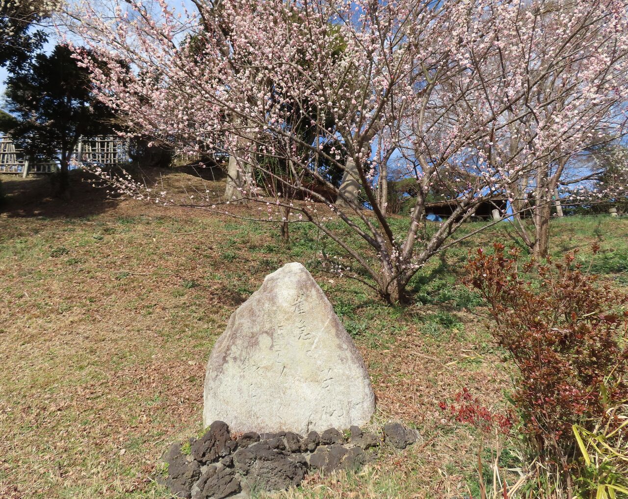 路傍には正岡子規の句碑が、「崖急に梅ことごとく斜めなり」この場所そのものを詠んだリアリズムの俳句ですね。