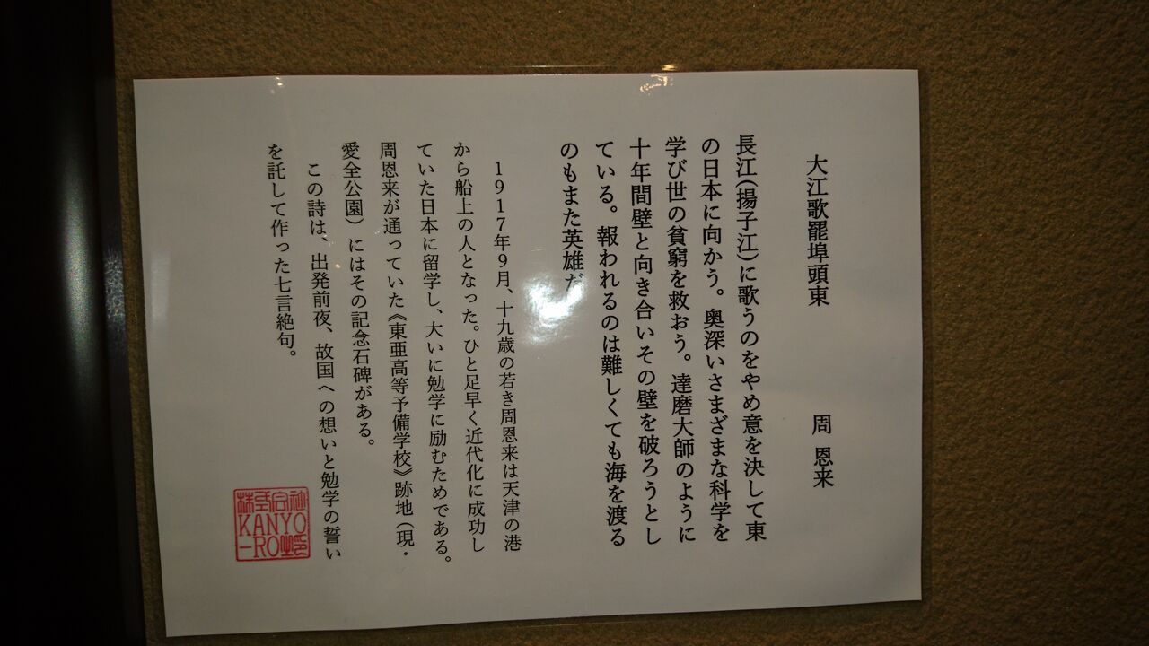 1917年、19歳の周恩来が、神田にあった東亜高等予備学校に留学していた際、ここ漢陽楼で故郷江蘇省の郷土料理であった獅子頭に出会い、感激したという歴史があります。